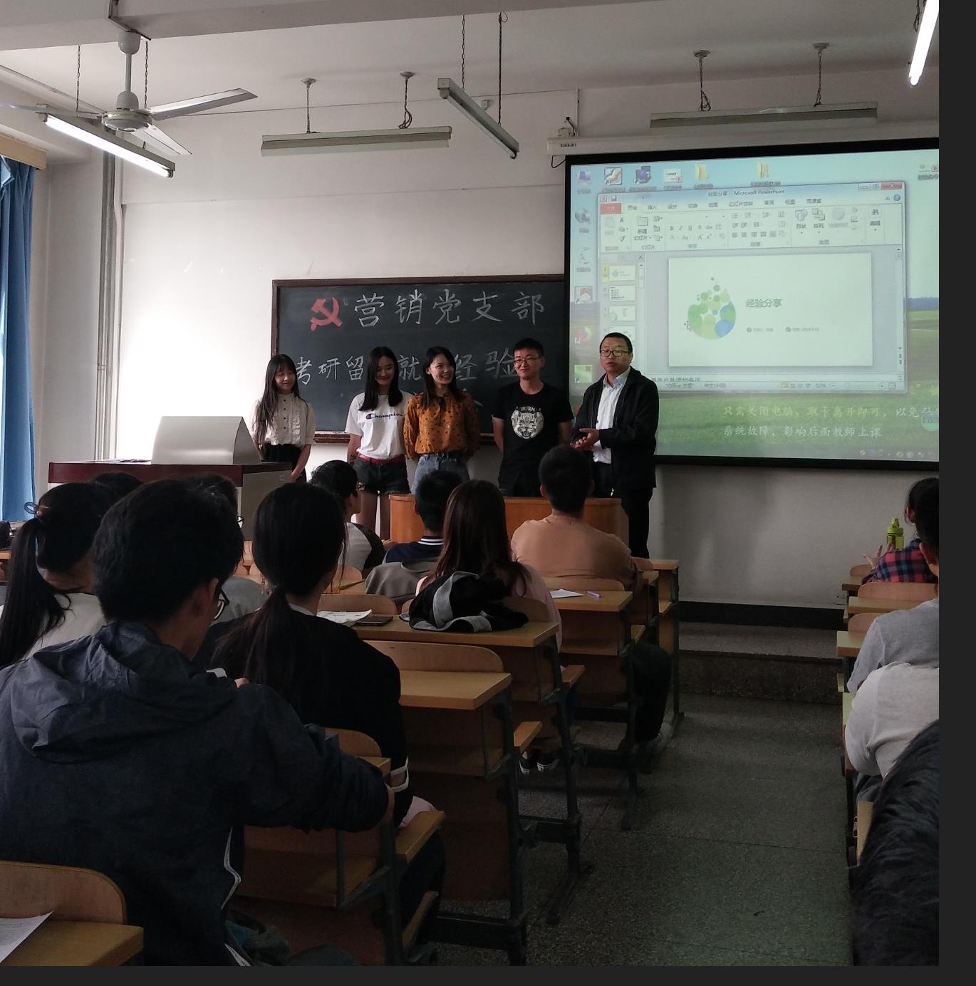 最后登台的是熊玉娇同学,她跟大家分享了几个月来的求职经验。她考研报考了中国人民大学的经济学专业,但遗憾地未能成功。考外校,尤其是跨专业考名校,的确存在较大的失败风险。但失败之后,要尽快坚强起来,用最好的心态去面对,用努力来证明自己的价值!她先后经历了多次面试,拿到了多个单位的offer,还乐于把就业机会与同学们分享。